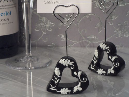 Baby Keepsake Stylish, Seat your guest in style with our stylish Damask theme place card holders. Each black open heart is accented with a hand painted white damask theme , the resin base is attached to a metal stick card holder . You guest are sure to fall in love with these favors , after your affair they can use these adorable favors in their homes as a photo holder as well. Each resin place card holder stands 3.25" tall. ... This unique & elegant item is part of our exclusive Wedding Favor and Bridal - Baby Shower collection. They make for a great and unique gift for your wedding reception, bridal shower, bay shower or any other special event.